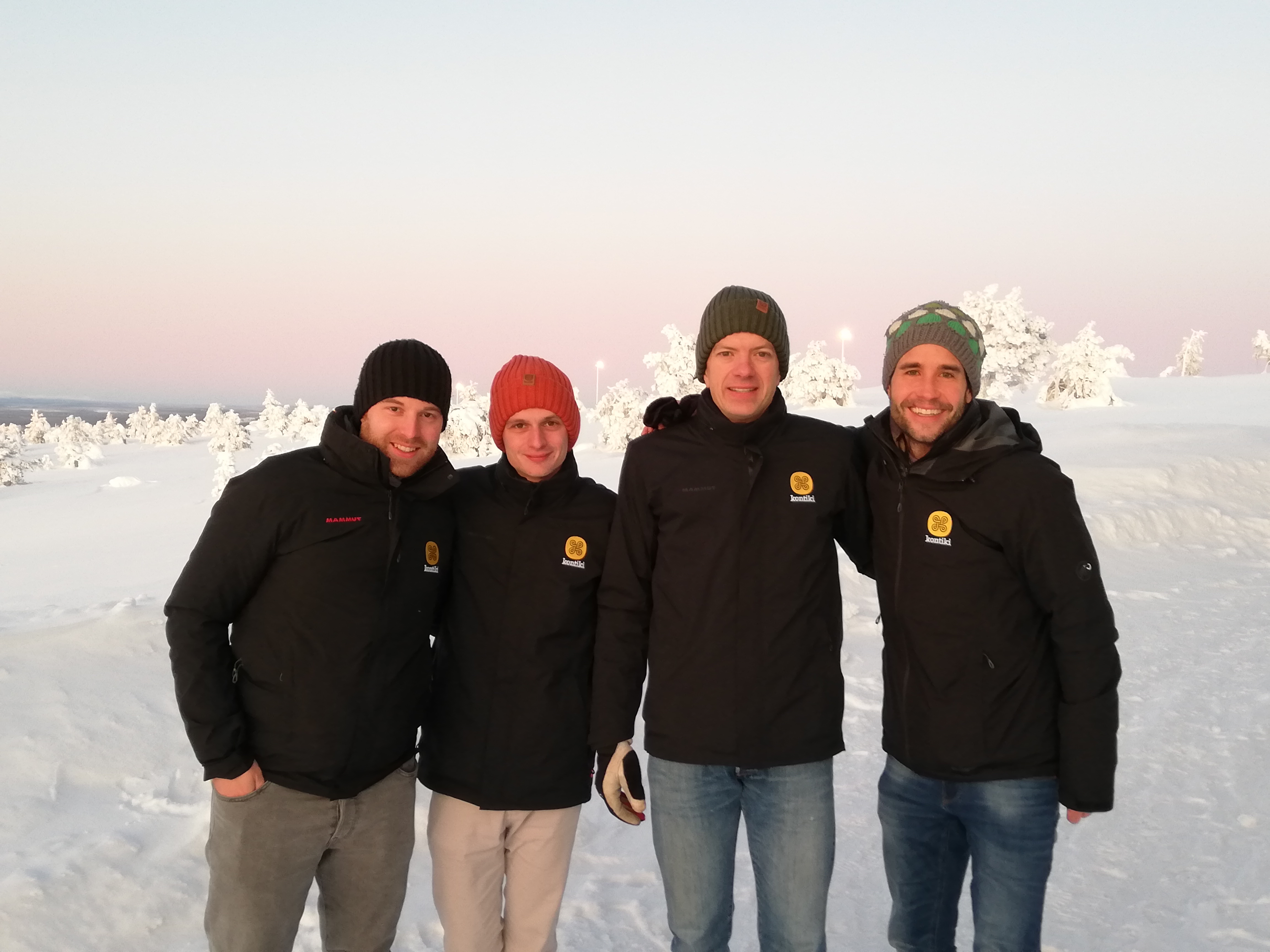 Von Mitte Dezember bis Mitte Januar sorgt die Polarnacht für eine pastellfarbige Dämmerung, auch Kaamos genannt. Die Gästebetreuer geniessen die lezten Sonnenstrahlen in Äkäslompolo.